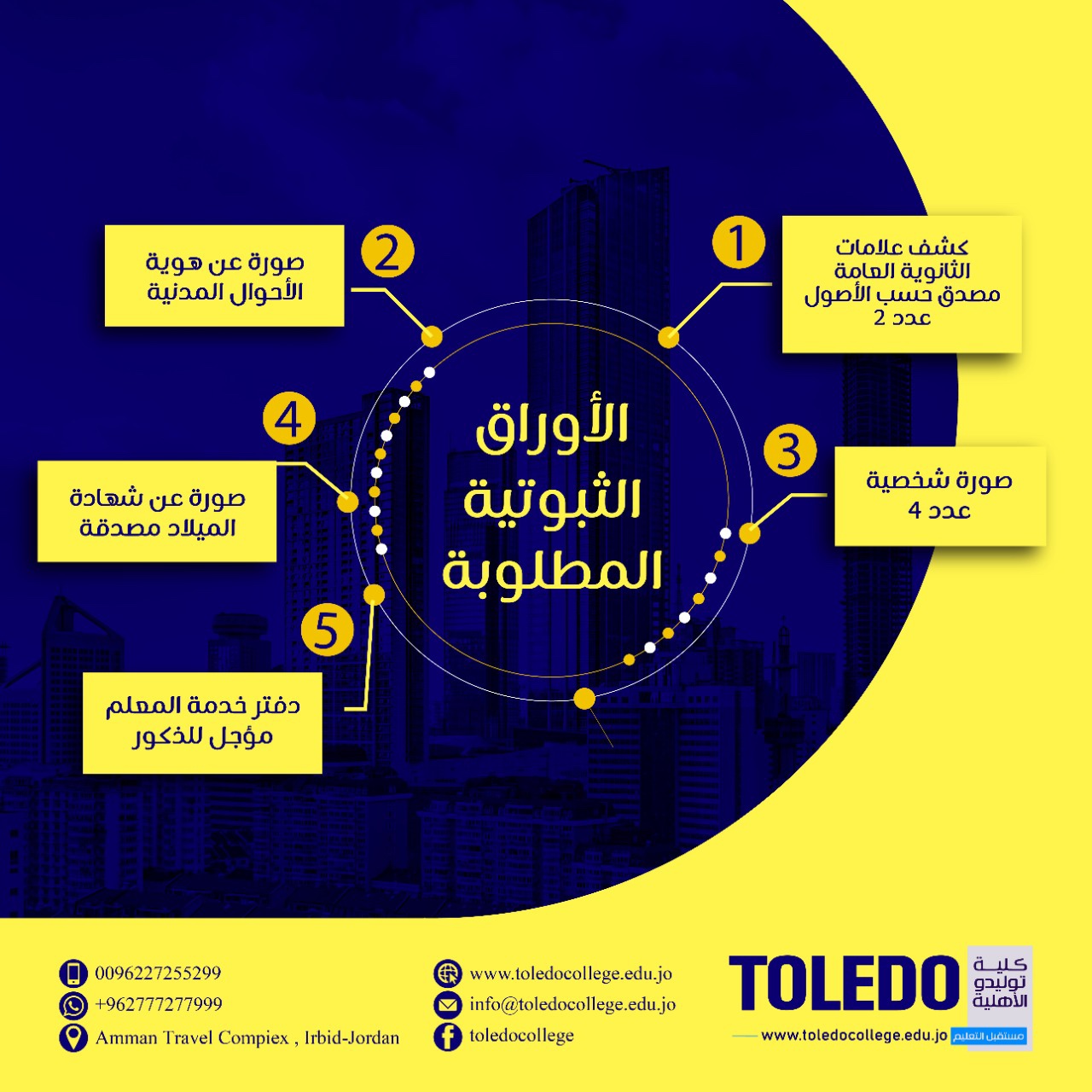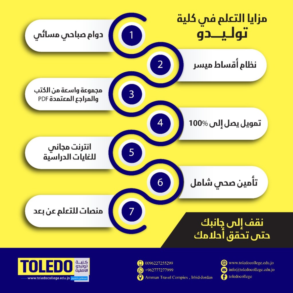 بدأت كلية توليدو في مزاولة مهامها مستمرةً في تطوير برامجها بما ينسجم مع حاجة البلاد، وتنمية مواردها البشرية لتلبية احتياجات سوق العمل و الاستمرار في تقديم برامج تعليم عن بُعد ذات جودة أكاديمية، ونوعية متميزة.